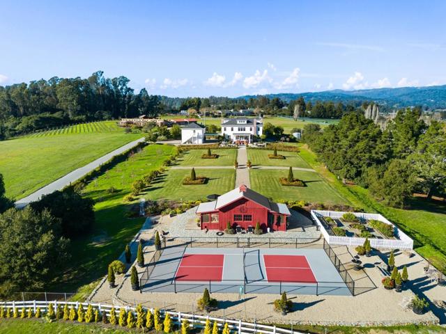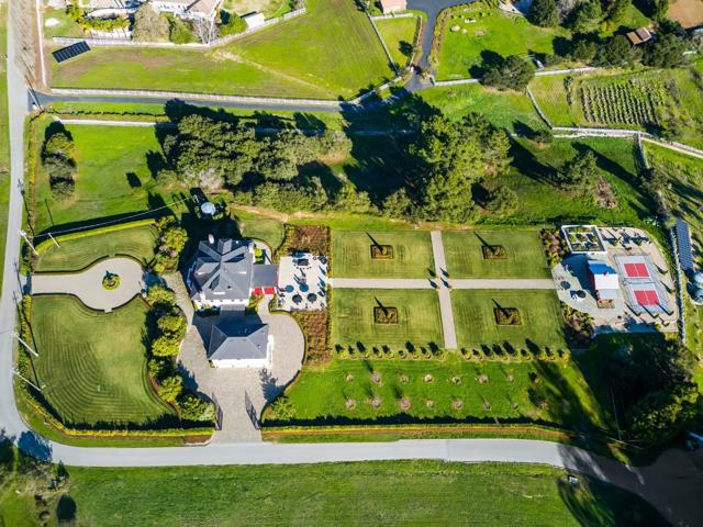 A modern country estate offering a captivating blend of refinement, sophistication & California living at its finest. Designed for both entertaining & luxurious everyday living, integrating breathtaking views, contemporary amenities & tranquility. Gated entry gives way to alluring front porch, leading to the spacious foyer featuring coffered ceilings & grand staircase. Elegant oak floors can be found sweeping throughout. Chefs kitchens w top tier appliances, large island & walk-in pantry. Natural light abounds as expansive windows provide panoramic vistas, framing the lush grounds like living masterpieces. Thoughtfully designed floorplan blends high end finishes & effortless livability. Situated on 5+ landscaped acres, the manicured grounds create an entertainers paradise. Indoor-outdoor living is enhanced by a generous patio complete w its own kitchen. Stroll the outdoor oasis of manicured lawns & rows of citrus trees to a fenced garden featuring raised beds & potting shed. Pickleball anyone? Enjoy countless hours of fun on your own court, making a lifetime of memories. Car enthusiasts rejoice in the 3 car garage for all your treasures. Separate ADU located above the garage. A rare opportunity to own a serene retreat, a bespoke masterpiece designed for those seeking their ace.