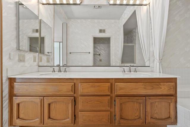 Welcome to this beautiful, light-filled two-story townhome in the Las Floras community of Bernardo Heights. This rare model feels like a single-family home, offering a spacious open floor plan with vaulted beamed ceilings, abundant natural light, and a cozy gas fireplace in the living room. The kitchen features a charming breakfast nook that overlooks the private front courtyard. The home includes two primary suites, one upstairs and one downstairs, plus an optional third bedroom or office on the first floor along with a half bath and laundry closet. An additional room upstairs provides extra storage space. Located on a private, quiet cul-de-sac with ample guest parking, this home offers both a front courtyard and a rear patio for outdoor relaxation and entertaining. The attached two-car garage provides direct entry to the courtyard. Enjoy a low-maintenance lifestyle with HOA coverage that includes water, trash, roof, fencing, basic cable TV, and common area maintenance. As a Las Floras resident, you’ll have exclusive access to the Bernardo Heights Community Center, featuring two pools, a spa, tennis courts, a fitness room, billiards, newly added pickleball and basketball courts, and elegant lounge areas—all part of the vibrant country club lifestyle this community offers. Conveniently located just a short walk to Lucido Park, Bernardo Heights Middle School, and Rancho Bernardo High School in the highly acclaimed Poway Unified School District.