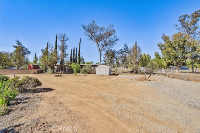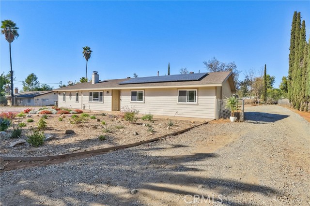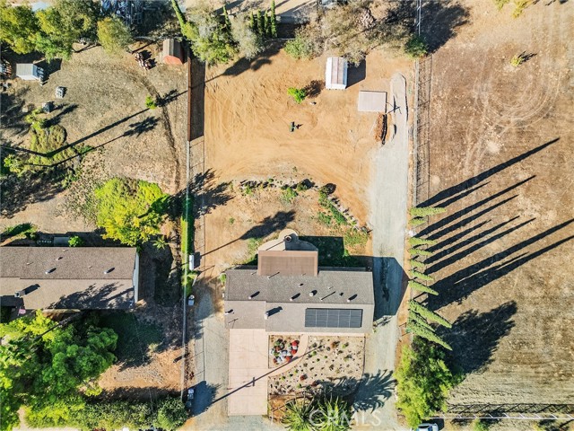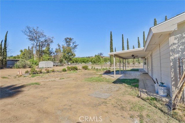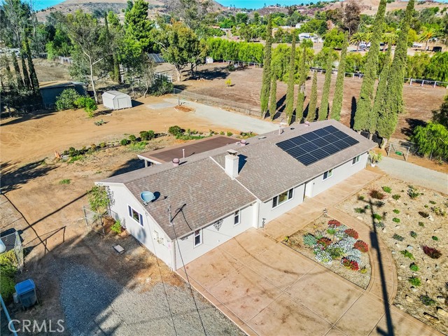 Step outside to an expansive fully fenced backyard featuring a metal shed, a 10x14 foot slab ready for a shop/or shed, a covered patio with misters, stamped concrete, and a propane firepit—ideal for entertaining. The yard also has two drive through 12 foot gates. The front of the home boasts a large 6-inch steel-reinforced, colored, and stamped concrete driveway with sidewalks and newly installed waterwise landscaping. Additional highlights include a newer roof with transferable warranty, paid solar, RV parking with a 50 Amp panel, an owned propane tank, a backyard sprinkler system, as well as front and backyard drip irrigation all on timers. There is a view of the hills from the front of the home, and the location could not be more ideal as it is located on a private quiet road.
