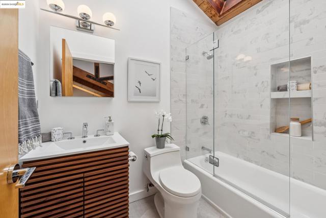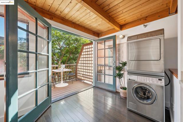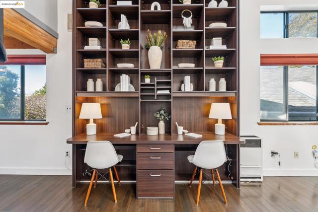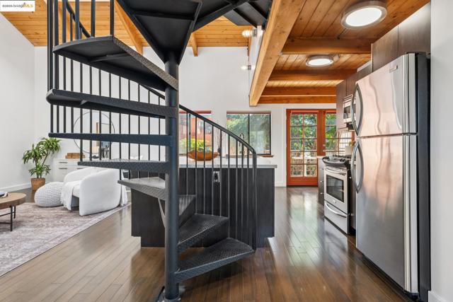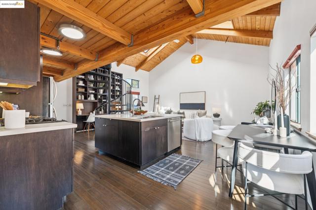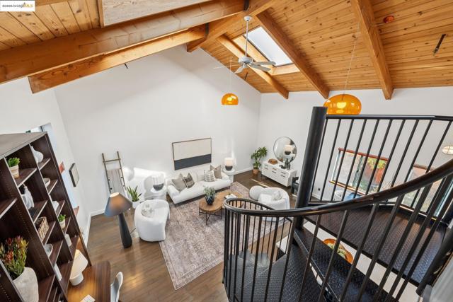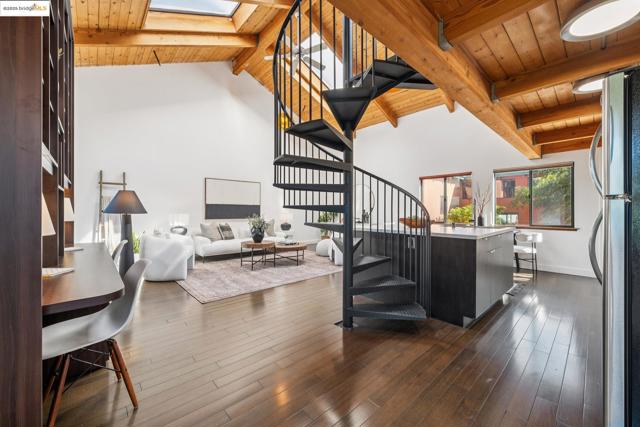 Welcome to Oceanview Lofts, a gated live/work community by Thomas Dolan. This luminous top-floor one-bedroom loft features double-height ceilings, oversized skylights, and expansive windows. Wood flooring and exposed beams lend warmth throughout. The open layout suits living and dining with ease, and the kitchen provides an island and ample storage. Dolan’s studio pioneered new-construction live/work in the United States and remains a recognized leader more than twenty years on. In-unit laundry is on the main level. The bedroom above offers a restful sense of privacy. A south-facing private deck looks over a serene courtyard with a tranquil fountain and lush greenery. One assigned garage space completes the offering. Enjoy world-class shopping and dining in the nearby Fourth Street shopping district. Close to Berkeley Bowl West, the Berkeley Amtrak station, and Aquatic Park, with easy access to I-80 and I-580 and public transit.