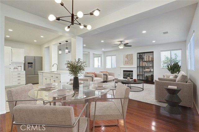 Step into this stunning open-concept living space that seamlessly blends modern elegance with everyday comfort. The kitchen showcases crisp white cabinetry, a spacious island with bar seating, built-in sink, and stylish pendant lighting—perfect for entertaining or casual meals. Flowing effortlessly into the living room, you'll find rich wood floors, recessed lighting, a cozy fireplace with a classic white mantel, and it could be accented by built-in shelving or mount flat-screen TV for relaxed evenings at home. This bright and inviting layout highlighting the clean lines and contemporary finishes throughout is ideal for both quiet moments and lively gatherings.