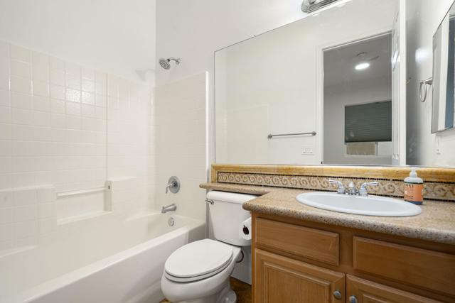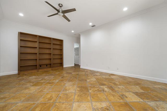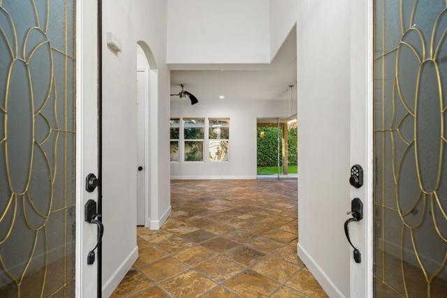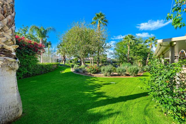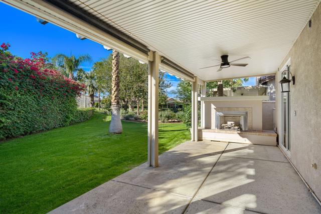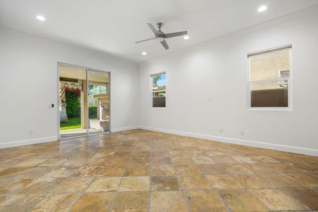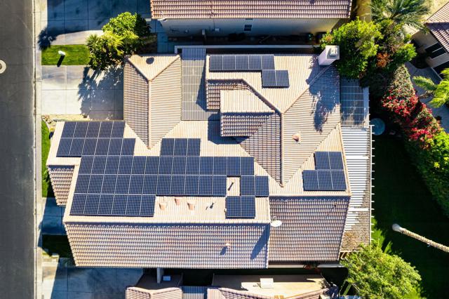 All the bells, all the whistles--absolutely no corners cut.This beautifully upgraded 3-bed, 3-bath home features owned solar, fresh interior paint, elegant travertine flooring throughout, and a freshly remodeled primary bathroom.Car lovers, hobbyists, and storage fanatics will drool over the spectacular 5-car garage, complete with custom paint, epoxy floors, built-in cabinets, and a 240V EV charger. The generously sized RV bay connects to the 2-car garage in an L-shape, while the golf-cart garage remains separate--parking perfection.A large driveway and gated courtyard create a welcoming entry. Inside, the spacious great-room layout includes built-in shelving and a cozy fireplace. Sliding doors off the dining area lead to an expansive covered patio with a second gas fireplace, open to a private lawn that extends to a serene common area with a pond, waterfall, and lush landscaping.The community allows short-term rentals and offers multiple pools, making it ideal as a full-time home, getaway, or investment. Note that some photos have been virtually staged with furniture.