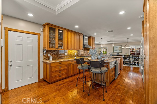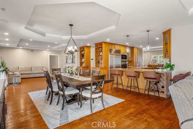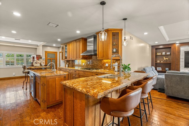 At the heart of the home lies a true chef’s kitchen where no expense was spared. Outfitted with premium stainless steel appliances including a Wolf range, Sub-Zero refrigerator, and Bosch dishwasher, the space is elevated by custom Tiger Oak cabinetry and multiple granite preparation surfaces designed to inspire culinary creativity. The kitchen flows seamlessly into the expansive family room and dining area, creating an open-concept environment perfectly suited for sophisticated entertaining.