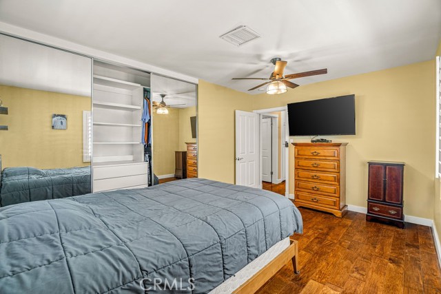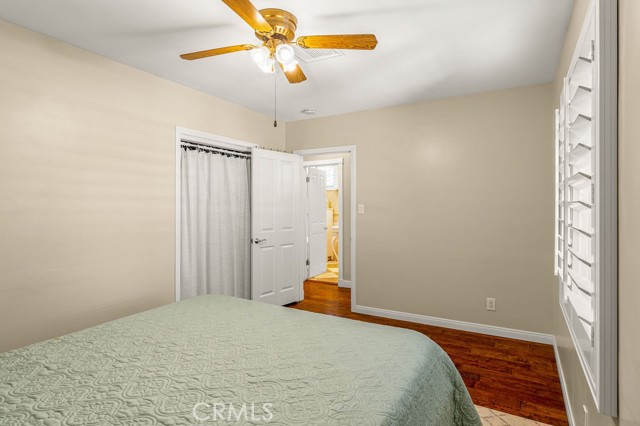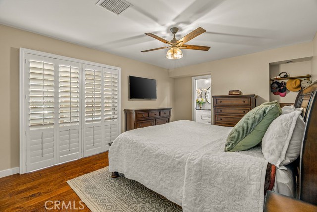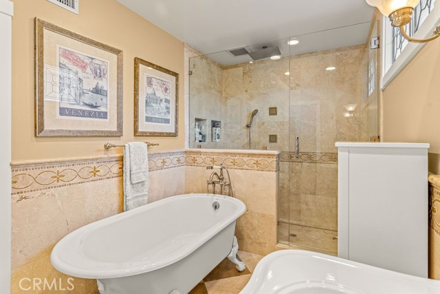 All three bedrooms feature hardwood flooring, ceiling fans, and custom closet organization. The primary suite is a serene retreat, complete with a walk-in closet, spa-inspired en suite bath, and expansive sliding glass doors opening directly to the backyard sanctuary. The hall bath evokes boutique luxury with a classic claw foot soaking tub and separate walk-in shower.