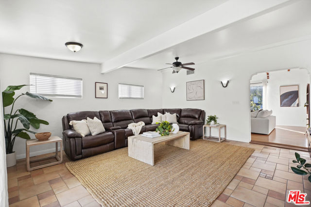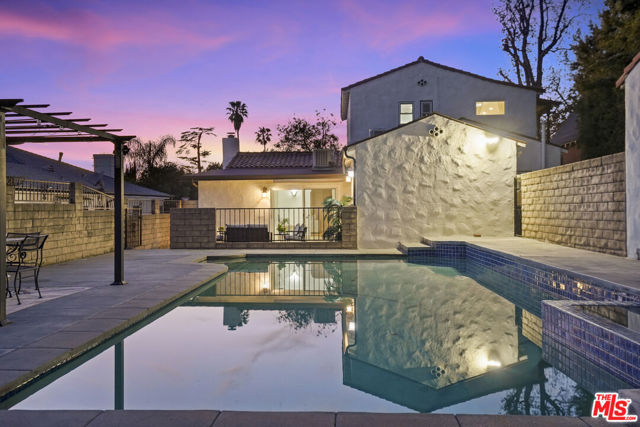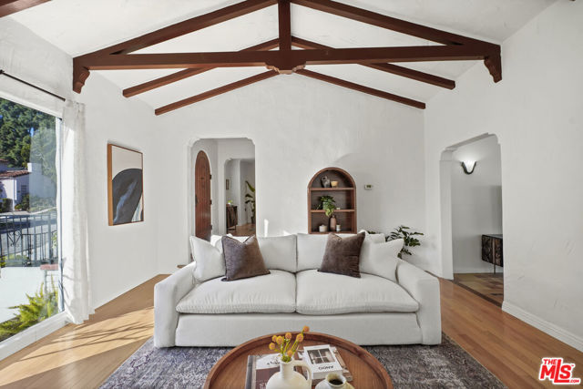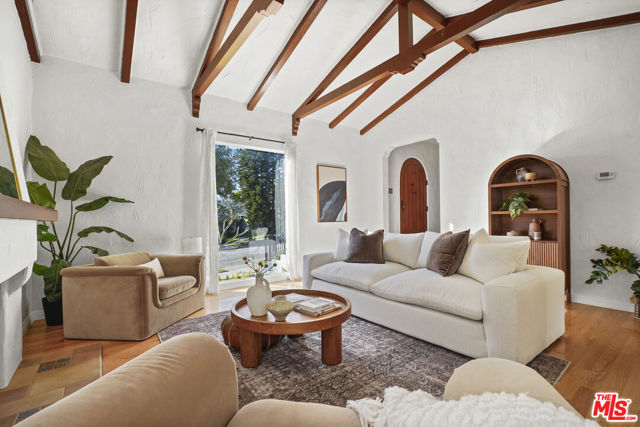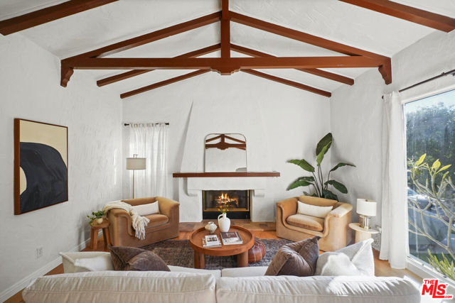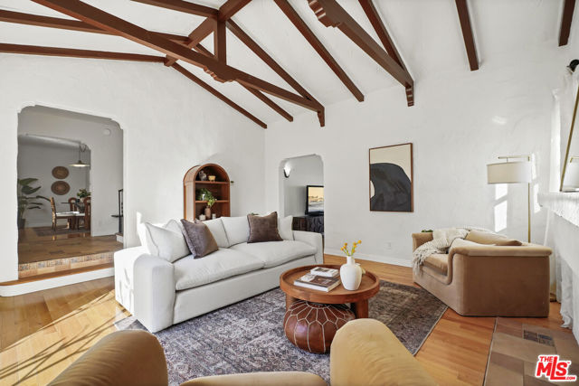 Set just off of Mountain St in Rossmoyne, this 1926 Spanish residence reflects the architectural character that defines the neighborhood. Encompassing 2,268 square feet on a 6,728 square foot lot, the home pairs classic detailing with generous living spaces and a backyard designed to capture its city views. A traditional stucco facade and arched entry lead into a living room that immediately impresses. Exposed beams span the ceiling, adding warmth and dimension, while a subtle step-down creates architectural interest. A fireplace anchors the space, flanked by large picture windows that draw in natural light. Hardwood floors extend into the formal dining room, where plaster walls and traditional lines reinforce the home's Spanish roots. The kitchen is well situated within the floor plan and offers ample room to cook and gather. Its comfortable scale allows for flexibility, and a built-in desk area provides a practical workspace for daily routines, planning, or working from home. Just beyond, the family room introduces a relaxed setting with tile floors and expansive sliding doors that open directly to the patio and pool, creating an effortless indoor-outdoor connection. Upstairs, the main bedroom serves as a private retreat, complete with a charming Juliet balcony that welcomes light and fresh air. A second upstairs bedroom sits nearby, while a third bedroom on the main level adds to the home's well-balanced layout. The backyard centers around a sun-drenched pool with surrounding patio space for dining and lounging. From here, views stretch across Glendale with a partial glimpse of Downtown Los Angeles, creating a striking backdrop both day and night. A detached two-car garage completes the property. With its beamed ceilings, fireplace, oversized windows, versatile kitchen, and thoughtful indoor-outdoor flow, this Spanish home offers architectural authenticity and a setting that feels distinctly Rossmoyne.