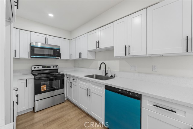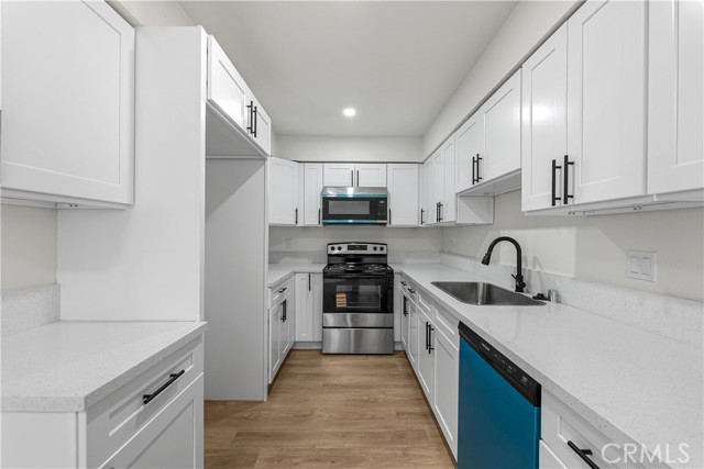 The kitchen is equipped with brand new appliances, including a stove, dishwasher, and microwave, complementing the home’s modern upgrades.