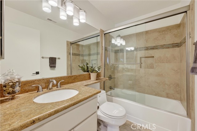 Just minutes (approx. 5 miles) from the beach, this beautifully upgraded 2-bedroom, 2-bath upper-level corner condo in Seacove Place offers the perfect blend of privacy and coastal living, with no neighbors above or below. Step inside to an open, naturally bright layout featuring vaulted ceilings, dual-pane windows, new luxury vinyl flooring, new ducting and insulation for added comfort and efficiency. The living area extends to a private balcony with peaceful neighborhood views—an ideal spot to relax and unwind. The updated kitchen is equally inviting with granite counters, stainless steel appliances, and a convenient pantry. The primary suite offers a calming retreat with vaulted ceilings, a walk-in closet, and an en-suite bath complete with dual sinks and a soaking tub. Additional highlights include in-unit laundry, an attached 1-car garage with direct access, and a reserved parking space. The HOA covers water and trash and provides access to a sparkling pool and spa, greenbelts, picnic areas plus dog-friendly paths.