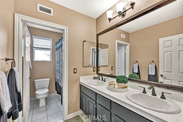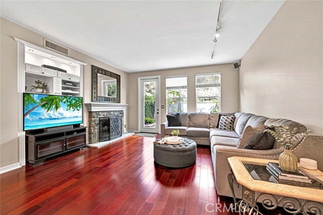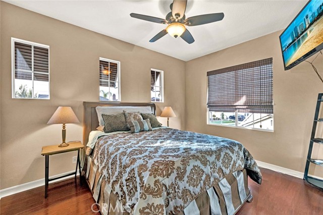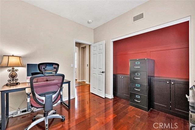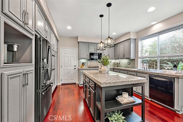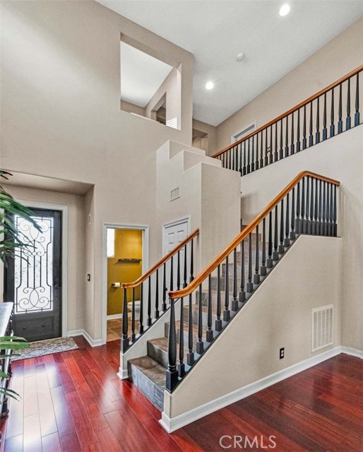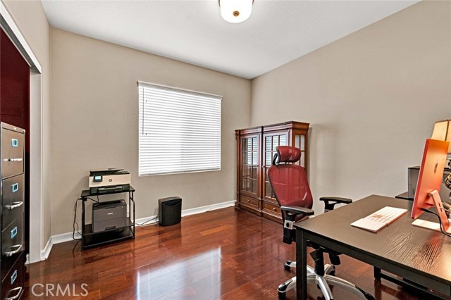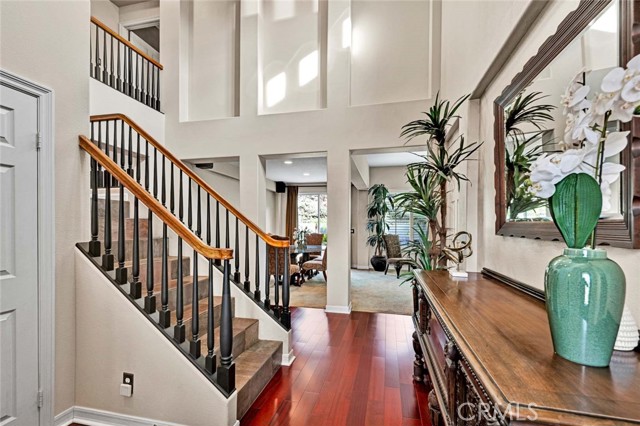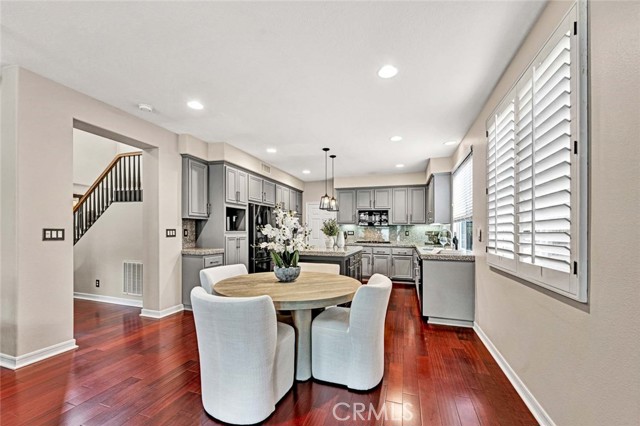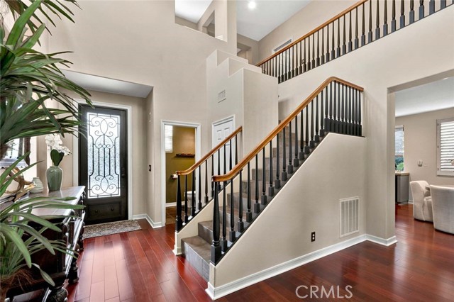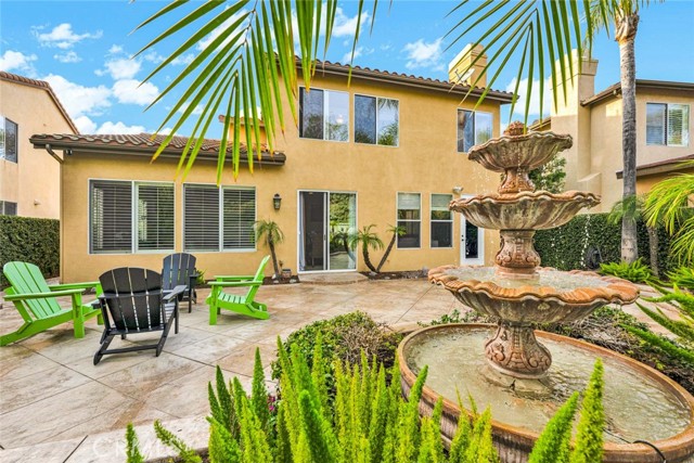 This beautiful home welcomes you with gorgeous curb appeal, highlighted by an aggregate-accented driveway, newer wrought iron fencing & dramatic up-lighting at the front entry. An elegant ornamental iron front door opens to a stunning 2-story foyer that sets the tone for the thoughtfully designed interior. Inside, rich wood flooring & honed slate create a timeless & sophisticated feel throughout the main living areas. The formal living & dining rooms are open & airy, offering direct access to the beautifully manicured backyard—ideal for both everyday living & entertaining. A charming upgraded powder room adds a stylish touch for guests. The upgraded chef’s kitchen is the heart of the home, featuring a large center island w/pendant lighting, abundant cabinetry, double ovens, 6 burner gas cooktop, large stainless steel sink, a dedicated coffee bar, upgraded wall outlet plates & a breakfast nook for casual dining. The kitchen flows seamlessly into the cozy family room, complete w/fireplace & access to the serene backyard.Upstairs, the spacious primary suite is a true retreat, boasting a spectacular remodeled bathroom w/a large walk-in shower, stand-alone modern soaking tub, dual sinks, a dedicated vanity area, custom stylish cabinets, custom wall backsplash, light up vanity mirrors & an oversized walk-in closet. Bedrooms 2 & 3 are thoughtfully located away from the primary suite, offering privacy, & are served by an upgraded secondary bathroom w/dual sinks and a separate room for toilet & shower/tub. A convenient workspace sits just outside the bedrooms, perfect for a home office or study area. The upstairs laundry room offers space for a full-size washer & dryer along with ample cabinetry for storage. There is possibility for a fourth bedroom, as the single-car garage—currently used as a home gym—can easily be converted into an additional bedroom. In addition, the two-car garage has custom overhead storage. The park-like backyard is a peaceful oasis w/a soothing fountain & plenty of space to personalize, garden, or entertain. Notable upgrades include a 5-ton A/C condenser, solar panels, bamboo flooring in the guest bedroom, a quiet smart garage door, new irrigation control, ceiling fans, upgraded slider screen, surround sound with Bose speakers, rain gutters, new paint, plantation shutters, many thoughtful enhancements throughout. This exceptional home offers comfort, style, and flexibility in a beautifully maintained setting—ready to be enjoyed!