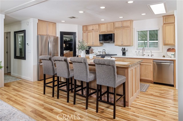 Inside, wood laminate flooring flows throughout, complemented by fresh interior and exterior paint, dual-paned windows, and an abundance of natural light. Oversized windows draw the eye outward to sweeping panoramic views, while a custom fireplace anchors the main living area with warmth and sophistication. The remodeled kitchen blends style and function with remarkable ease, featuring a butcher block island prepared for food prep, upgraded switches and outlets throughout the home. This truly is a generous space for intimate gatherings or everyday living.