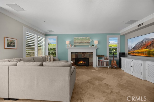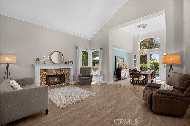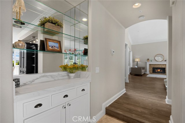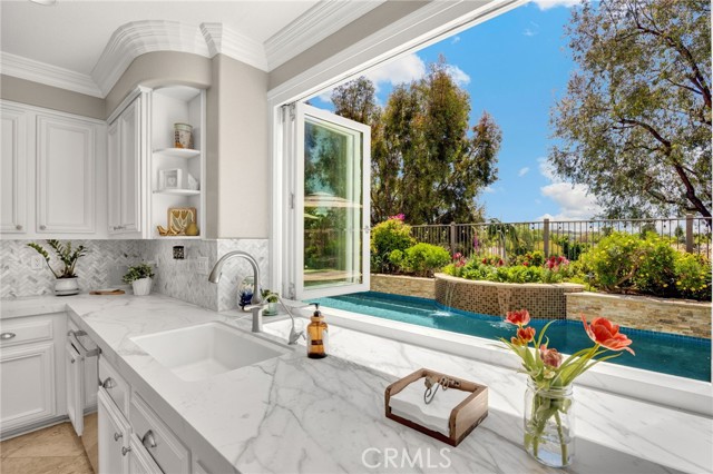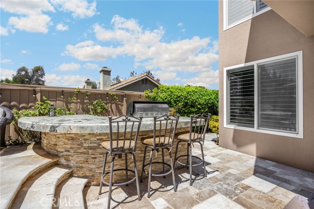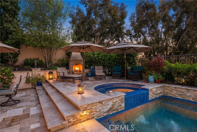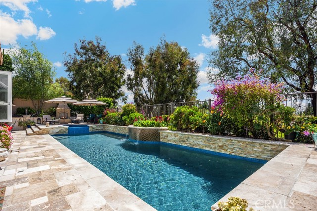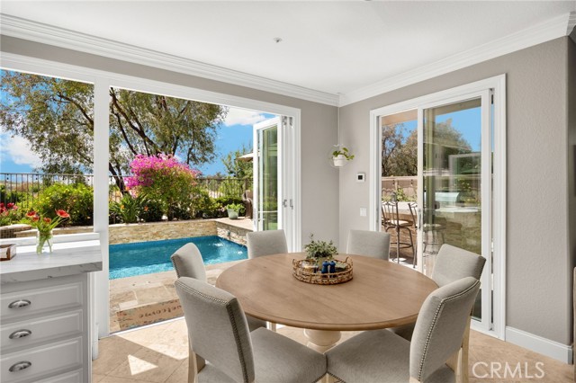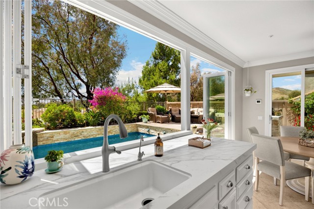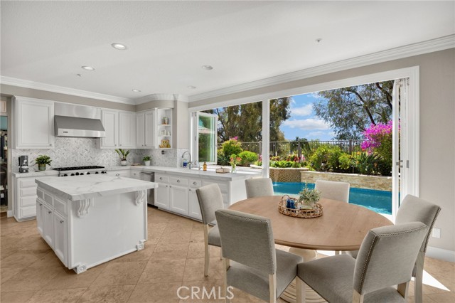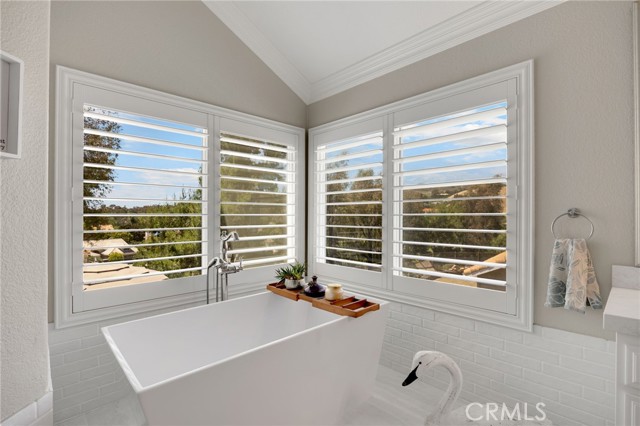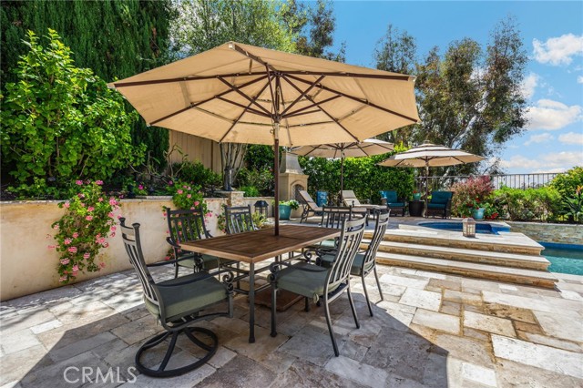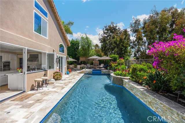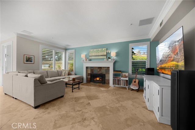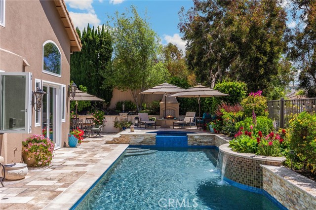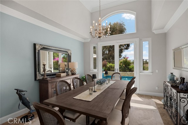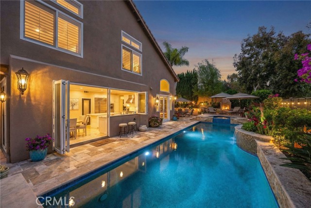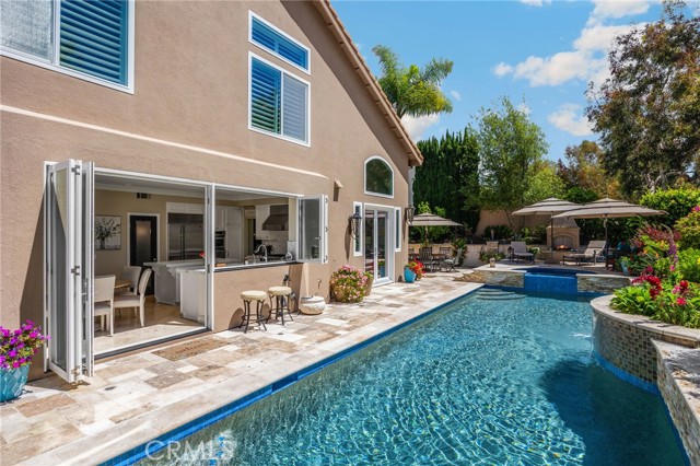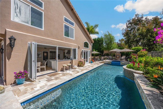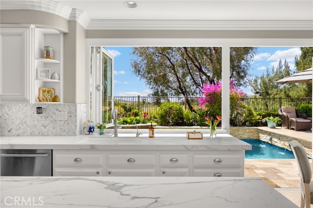 A rare find at the private end of a cul-de-sac, this beautifully upgraded 4-bedroom+office, 3 bath, 3317 sq ft coastal residence captures the essence of elevated San Clemente living. A very open, light-filled floor plan is enhanced by luxury vinyl flooring, custom shutters, vinyl windows, designer selected paint, crown moulding, and a fully prepaid solar lease-combining style, comfort, and efficiency. The entry opens to soaring vaulted ceilings and an elegant, updated fireplace in the living room, where natural light pours through large windows and flows into the dining room. French doors frame the resort backyard and sweeping views, bringing in ocean breezes and a bright, airy coastal ambience. The family room continues the open concept with travertine floors, a second updated fireplace, and a seamless connection to the kitchen. The chef’s kitchen is a true coastal showpiece with porcelain countertops on all surfaces, herringbone marble backsplash. Viking professional range, Thermador convection oven+warming drawer, Sub-zero refrigerator, Bosch dishwasher, RO water system under the kitchen sink, and a walk-in pantry. A dramatic bi-fold window, and bi-fold doors open the entire kitchen and breakfast area to the pool, panoramic views. A downstairs office/optional bedroom, full upgraded bath, and laundry room with sink. The primary suite offers vinyl flooring, crown moulding, custom shutters, walk-in closet, and a zen retreat area with fireplace. The spa-inspired bath features a stand-alone soaking tub, quartz counters, dual sinks. Secondary bedrooms feature vinyl flooring, mirrored doors, shutters. Step outside to your private resort backyard, where sweeping views and total privacy create a serene coastal escape. Enjoy a Revco solar-heated, salt-water PebbleTec lap pool with spa and waterfalls, enhanced by night lighting, an outdoor fireplace, a BBQ grill with generous seating, an elevated view lounge, and an outdoor dining terrace surrounded by lush landscaping. The 3-car garage is fully finished with epoxy flooring, built-in cabinets, and a Wen clean air system, offering a pristine space. Minutes from beaches, coastal trails, boutique shopping, dining, and top-rated schools, this home delivers the bright, open, private coastal lifestyle that defines San Clemente. This property is Stunning!
